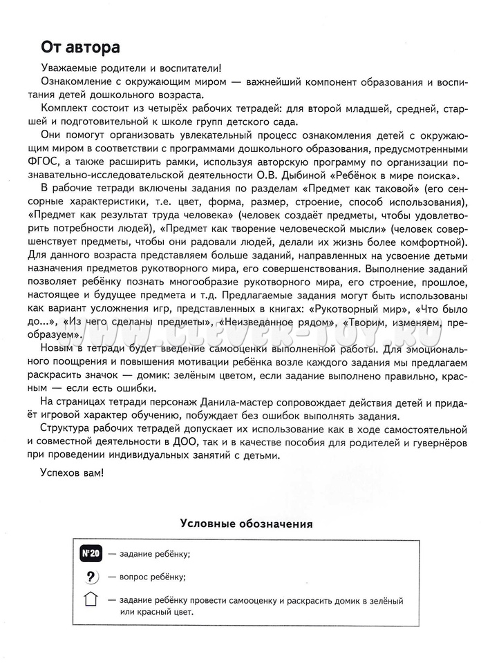 Тетрадь предназначена для работы с детьми 5-6 лет. Может помочь организовать познавательно-исследовательскую деятельность детей по авторской программе О.В. Дыбиной "Ребёнок в мире поиска" в детском саду, дома, в группах развития.