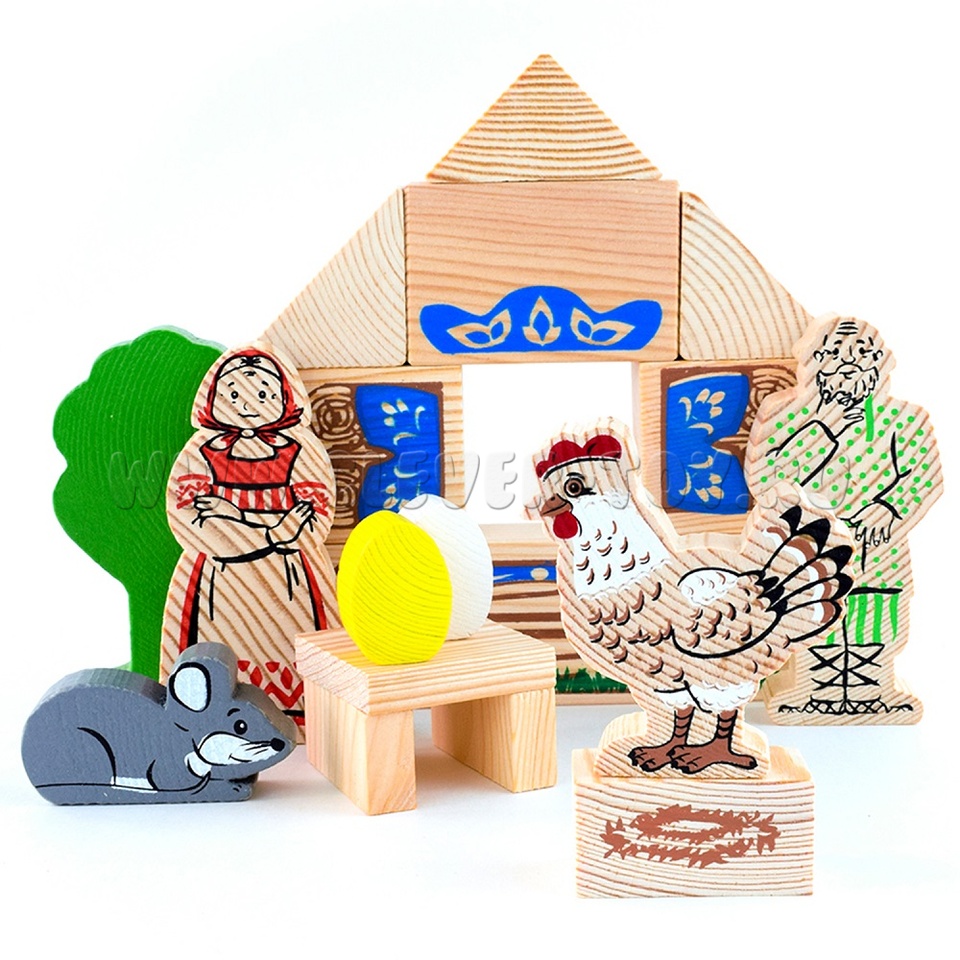 В набор входят деревянные модели персонажей и декорации сказки "Курочка Ряба" (всего 17 деталей).