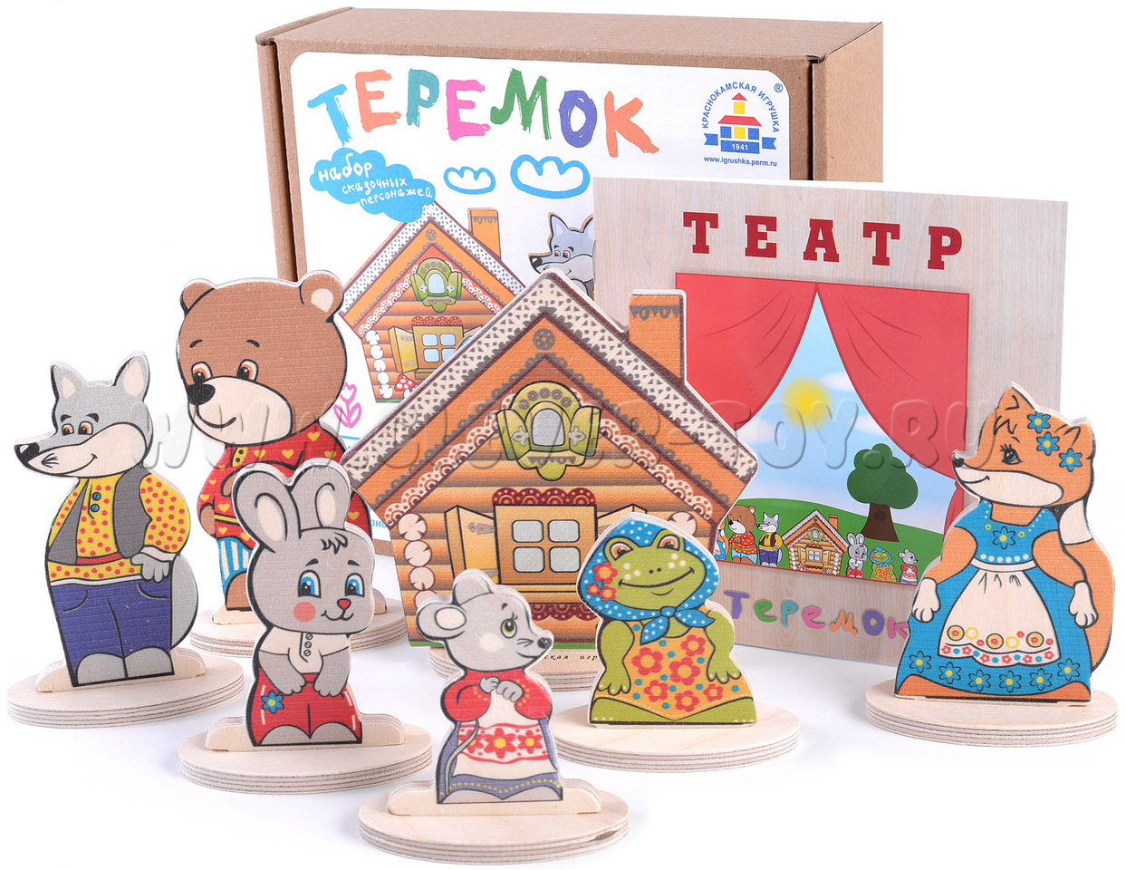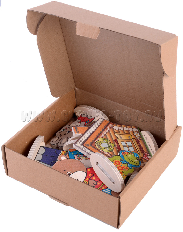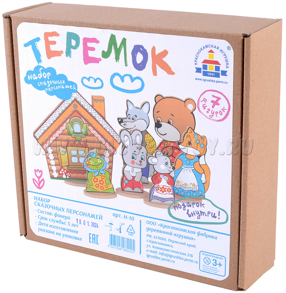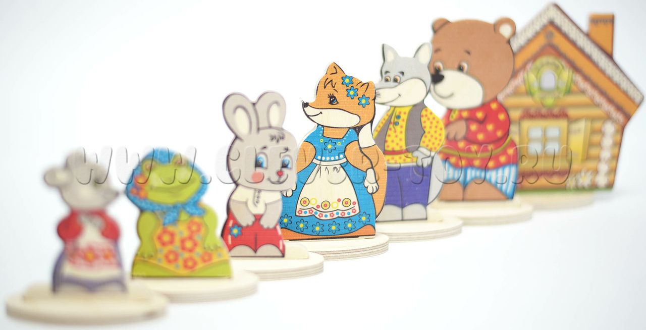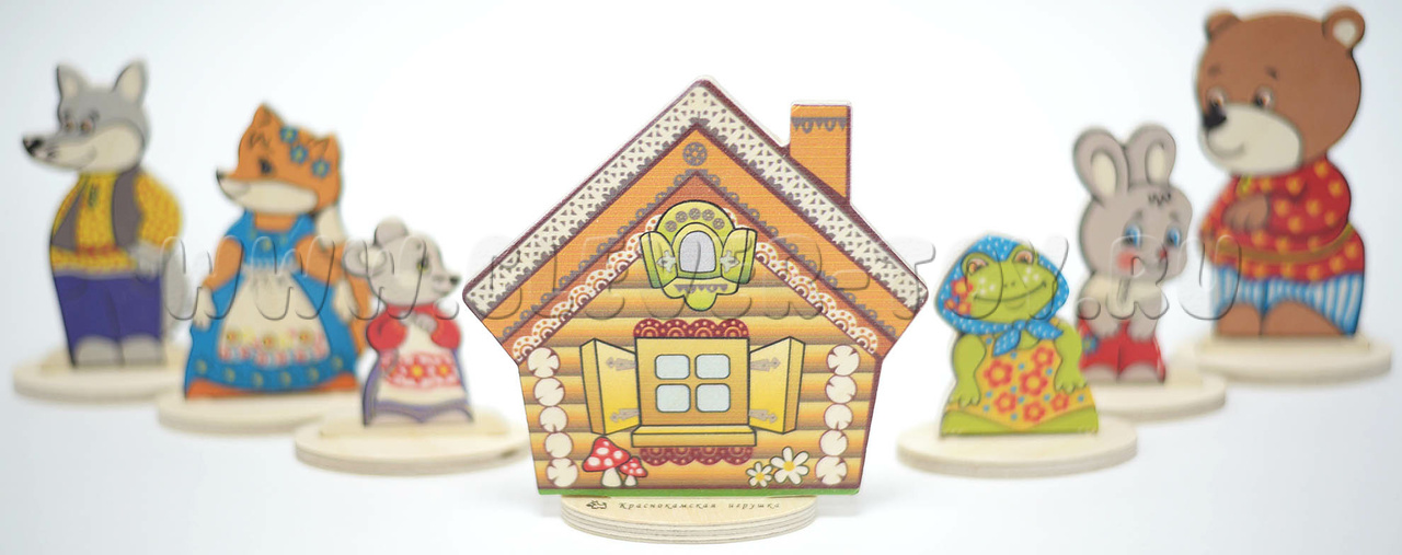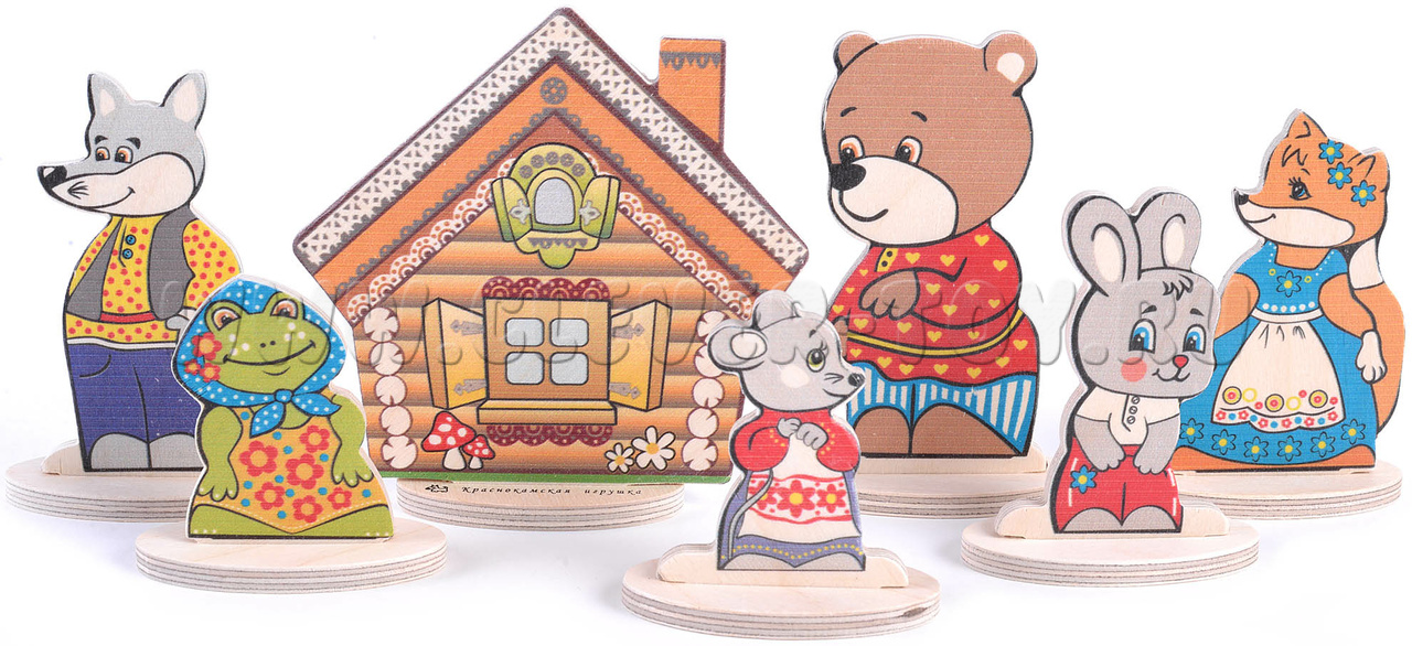 • 7 сказочных персонажей на подставках(заяц, мышка,лягушка, медведь, волк, лиса, теремок) от 6,5 до 12 см.;
