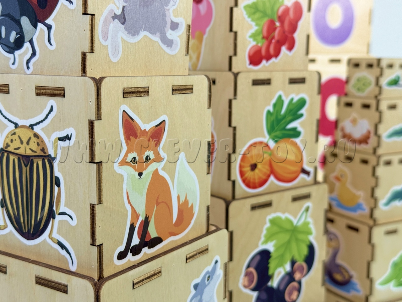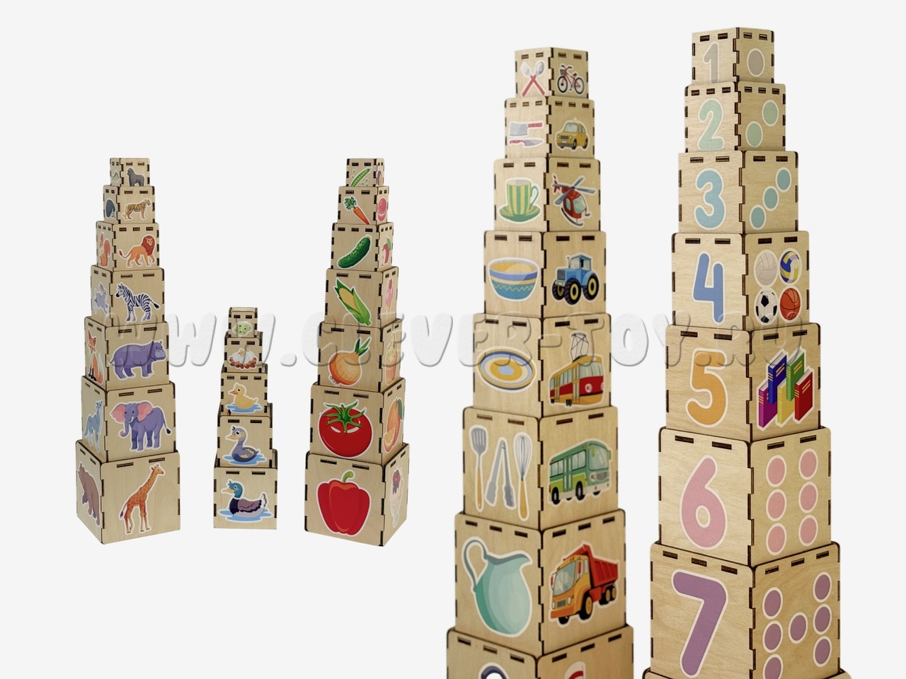 Кубики выполнены из прочной березовой фанеры. Изображения нанесены методом УФ-печати стойкими к выцветанию красками и покрыты лаком. Закругленные края исключают риск травмирования во время игры. Благодаря устойчивому основанию конструкция пирамиды надежно стоит на месте. Кубики складываются друг в друга, поэтому они не занимают много места при хранении.