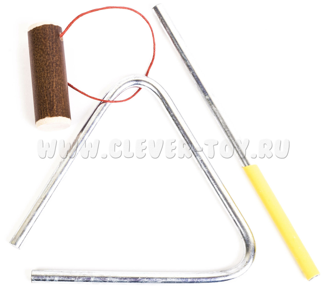 Треугольник выполнен из стали диаметром 6мм, длина стороны - 10см. Гальваническое покрытие не ухудшает качество звука и не разрушается при механическом воздействии. Ударная палочка из нержавеющей стали.
