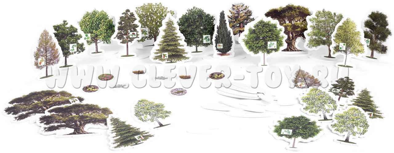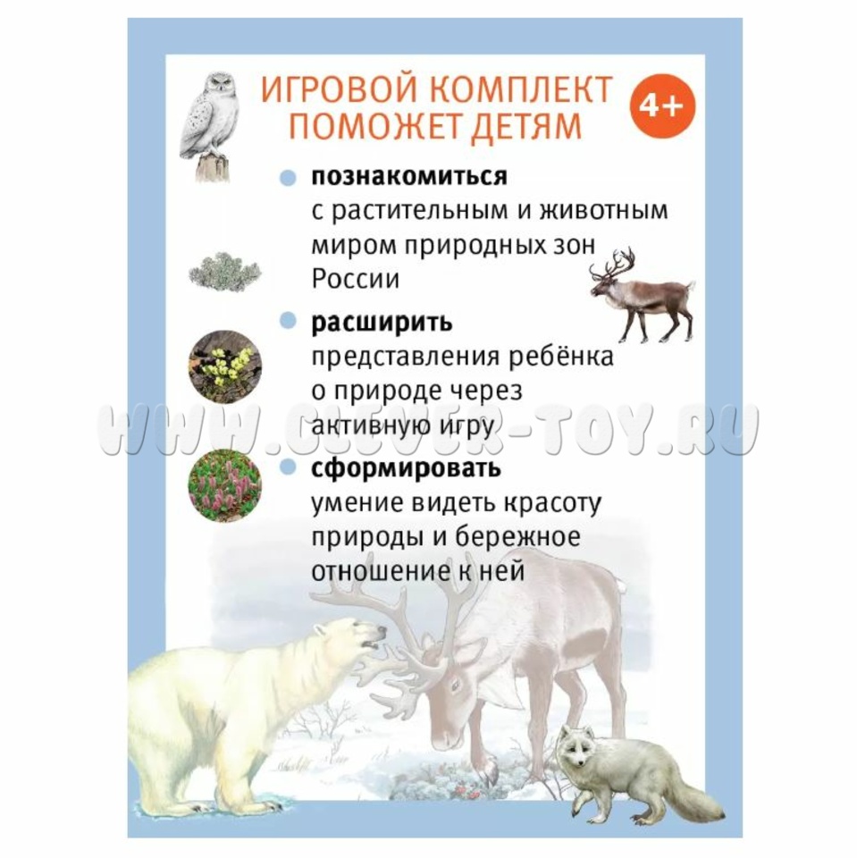 - Карточки природных зон России с животными и растениями (11 шт.; Ламинированная бумага): Арктическая пустыня, Области высокой поясности, Тундра, Лесотундра, Тайга, Смешанные леса, Широколиственные леса, Лесостепи, Степи, Полупустыни, Субтропические леса.
