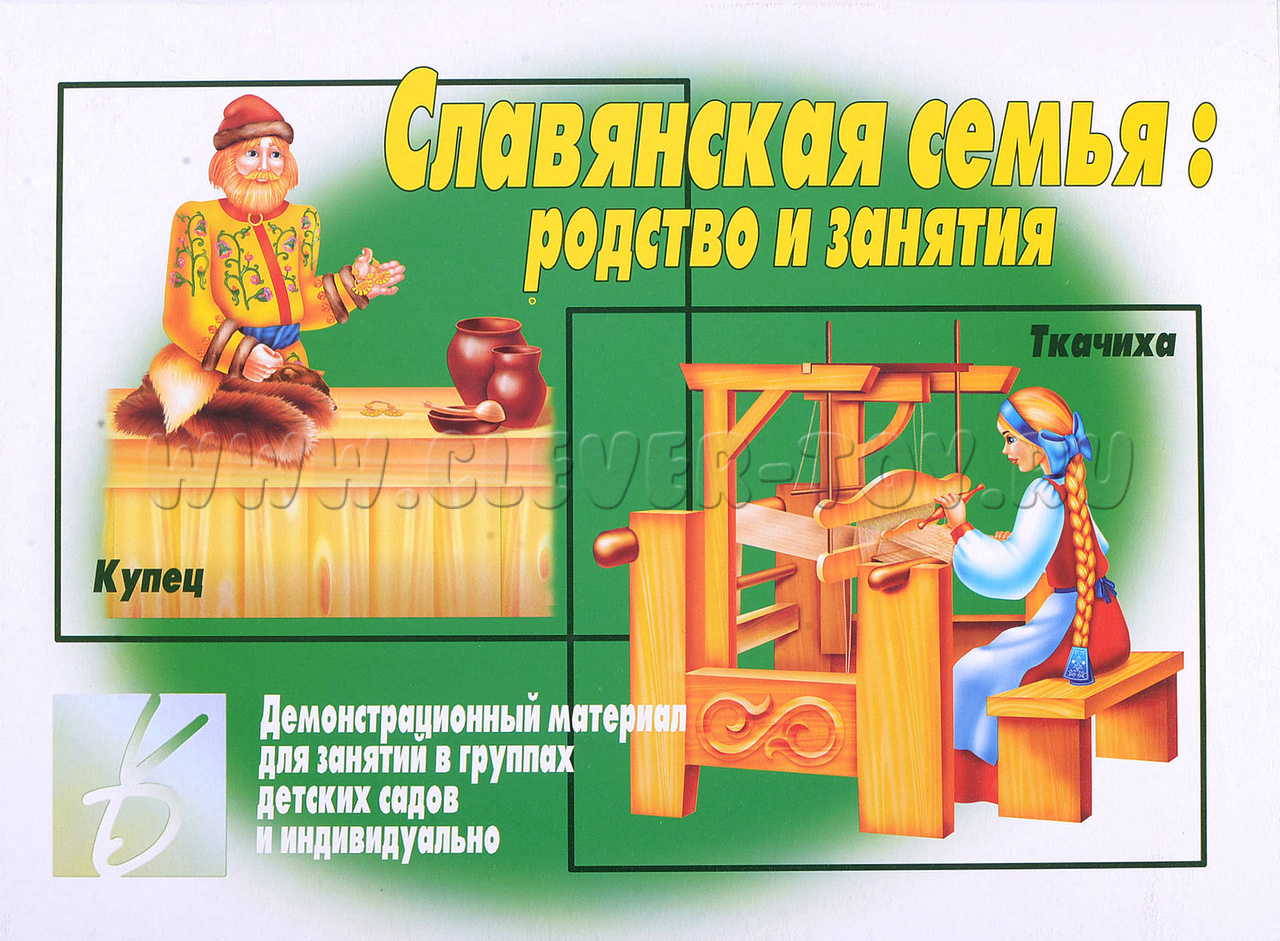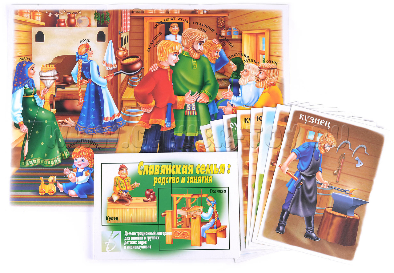 Предлагаем демонстрационный материал, знакомящий детей с историей Древней Руси, с образом жизни славян, их бытом и семейным укладом, ремеслами. Дети узнают все о родственных связях, кто, кому и кем приходится в семье. Изображения очень реалистичны, передают всю суть, знакомя детей с историей.