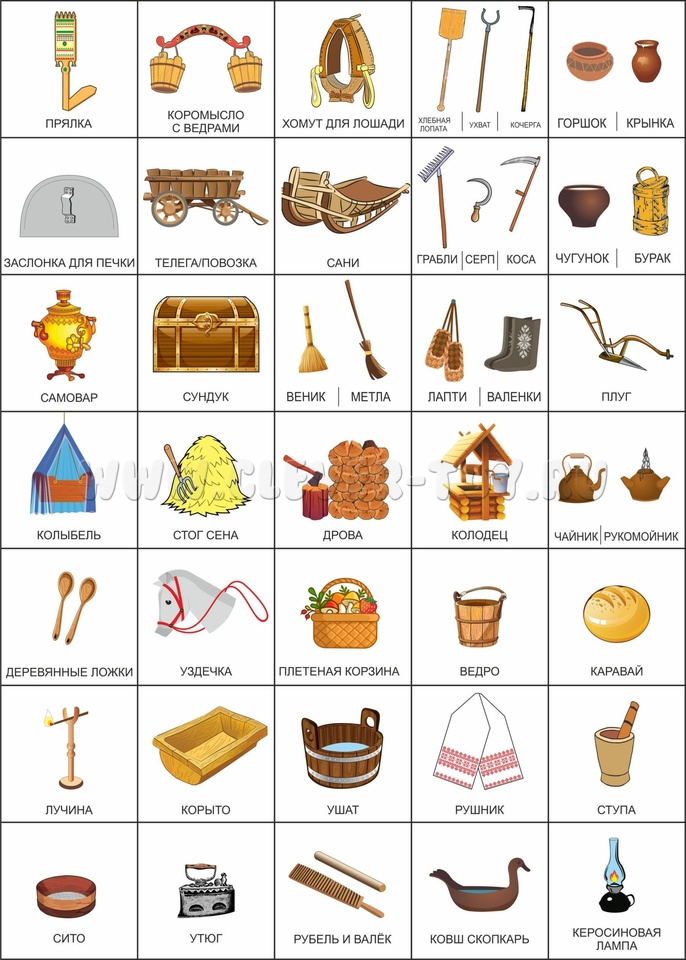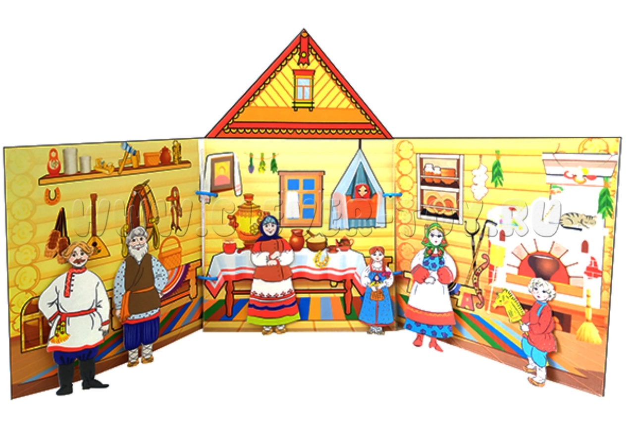 Вместе с папкой вы получите 6 фигурок людей (семья в национальных костюмах) и 35 карточек, изображающих предметы быта. Данный набор может использоваться как демонстрационный материал на занятиях по народной культуре.