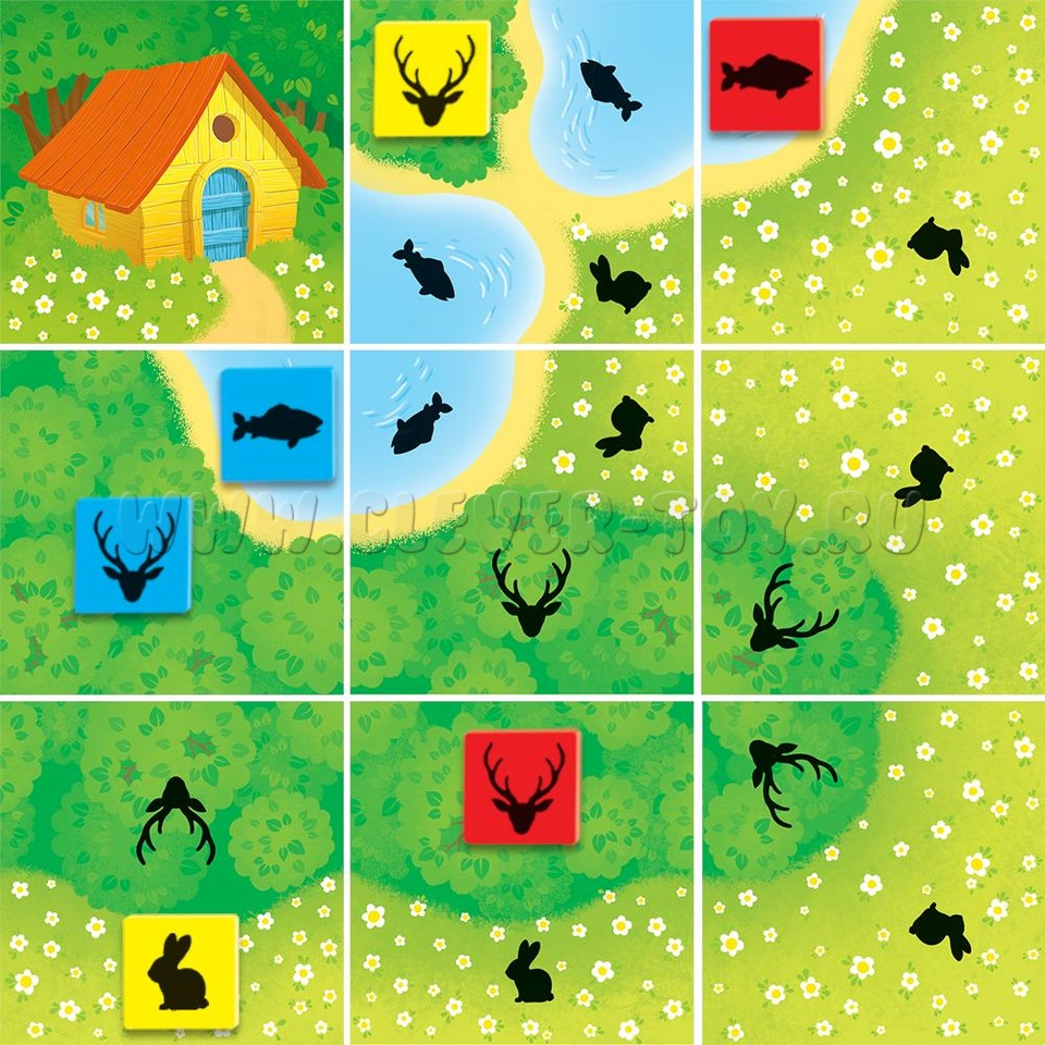 - 36 жетонов животных (заяц, олень, рыбка, разделены на 4 цвета синий, оранжевый, красный, жёлтый);