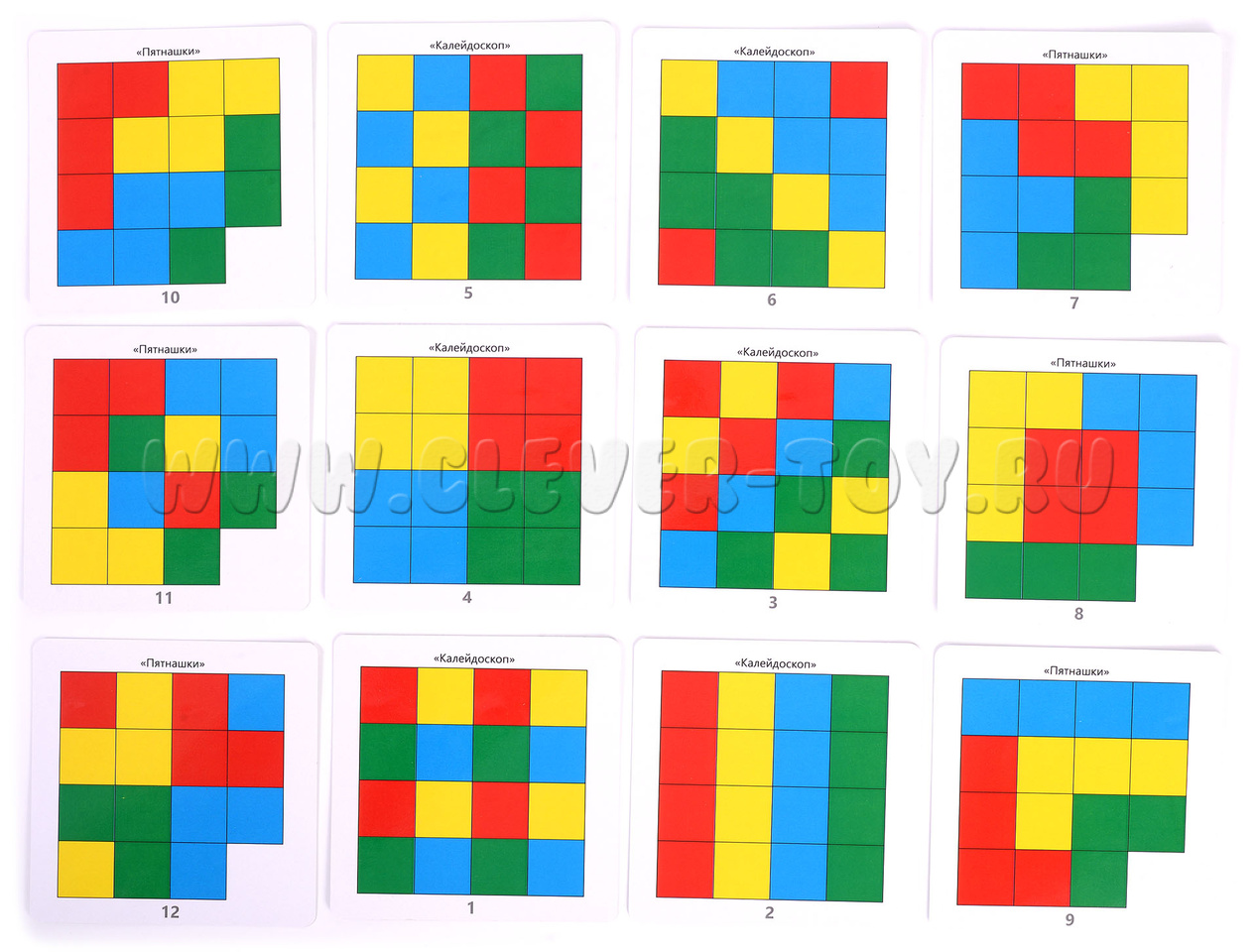4. Игра "Пятнашки". Установите одну из карточек «Пятнашки» в специальное отверстие посередине игрового поля. Попросите ребенка посчитать количество фишек каждого цвета на карточке. Разместите на одной половине игрового поля соответствующее количество цветных фишек в хаотичном порядке. Предложите ребенку переместить все фишки по образцу на карточке, передвигая их по игровому полю по одной.
