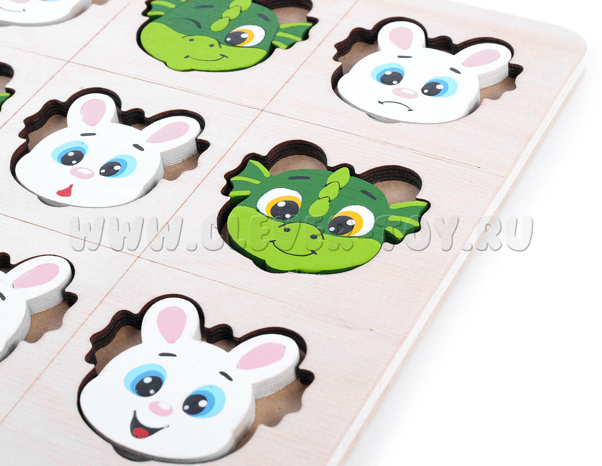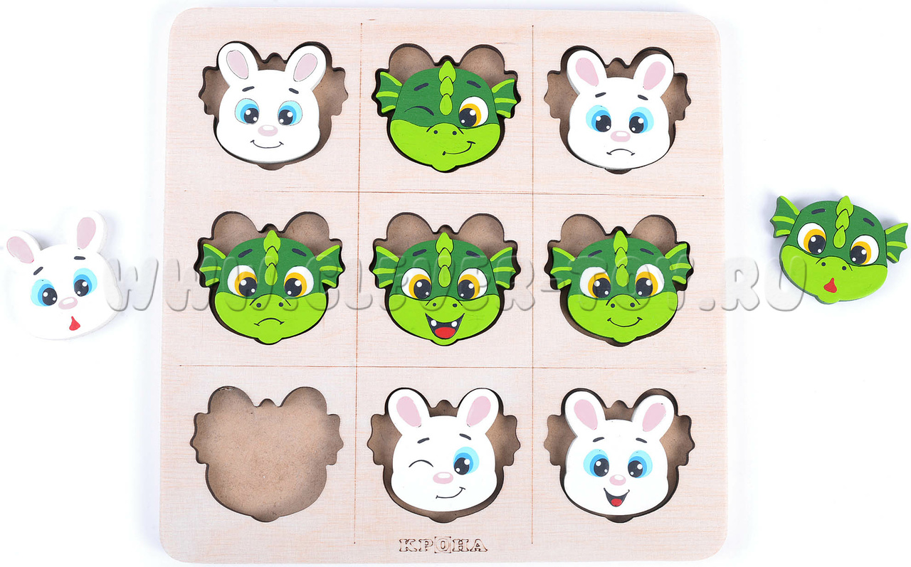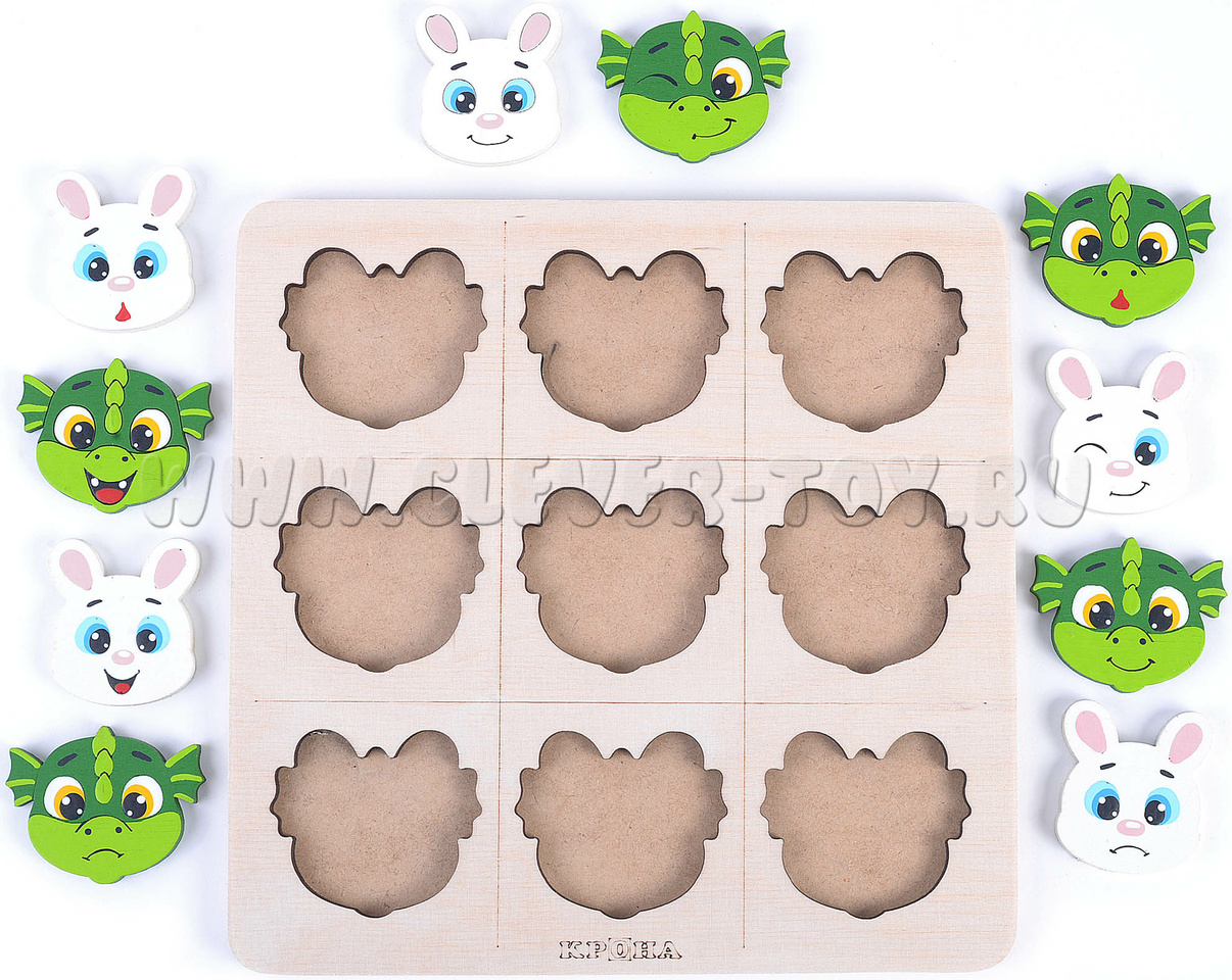Правила игры: очередность ходов не имеет значения, так как оба набора фигурок (зайчики и дракончики) представлены в количестве 5 штук каждый.