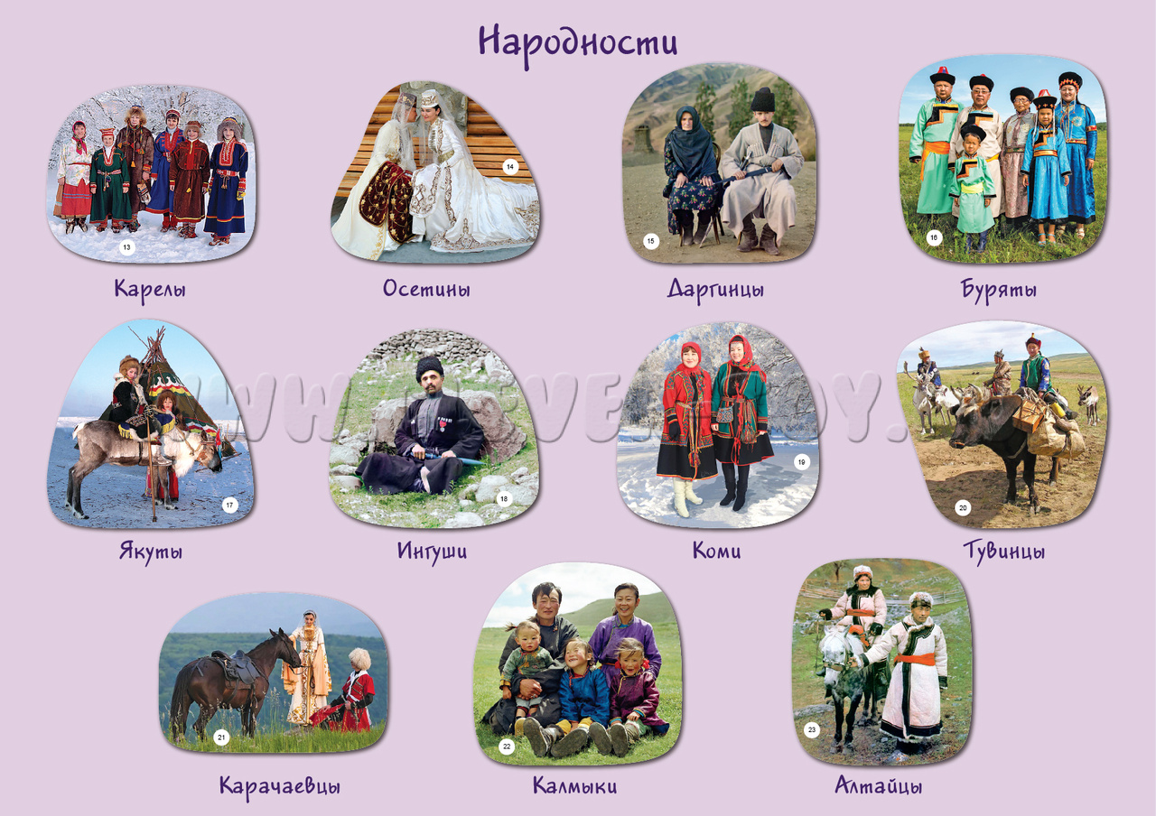 В наборе 23 магнитных карточки, которые рассказывают, о разных народах, проживающих в нашей стране.