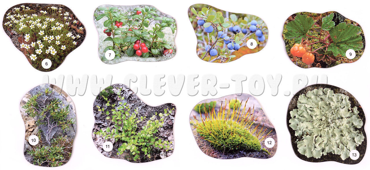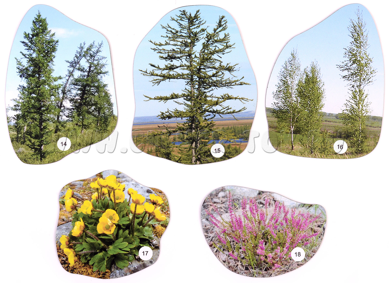 Но и те изображения деревьев, кустарников, цветов, ягод, лишайников, которые вошли в состав набора, внимательному взгляду позволят сделать весьма интересные наблюдения. Например, о том, что, допустим, березы на севере нашей страны, в ее средней части и на Дальнем Востоке сильно отличаются друг от друга. Растения в тундре гораздо более низкорослы, чем в широколиственных лесах. А в степях хозяйничают травы. Если после таких выводов вы зададитесь вопросом "Почему так происходит?", задача нашего пособия будет выполнена.
