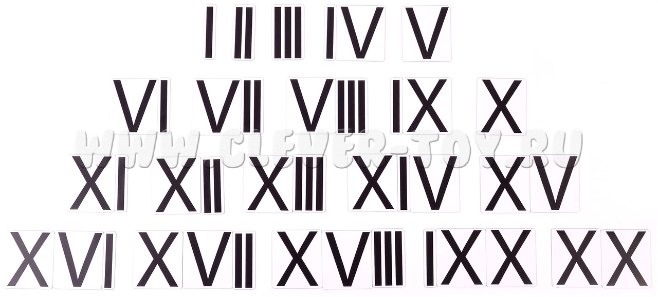 В наборе 40 карточек. Высота карточек: 7 см. I - 8 штук; II - 4 штуки; III - 4 штуки; V - 10 штук; Х - 14 штук.