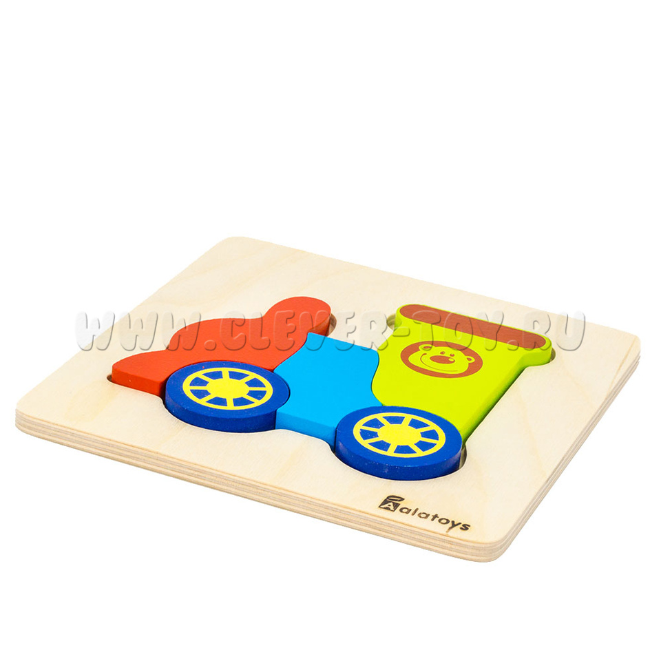 Пазл «Паровозик» представляет собой деревянную основу с углублениями для размещения деталей паровозика. Только правильно подобрав детали по форме и размеру, у ребёнка получится сложить правильные пазлы.