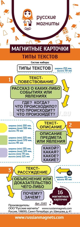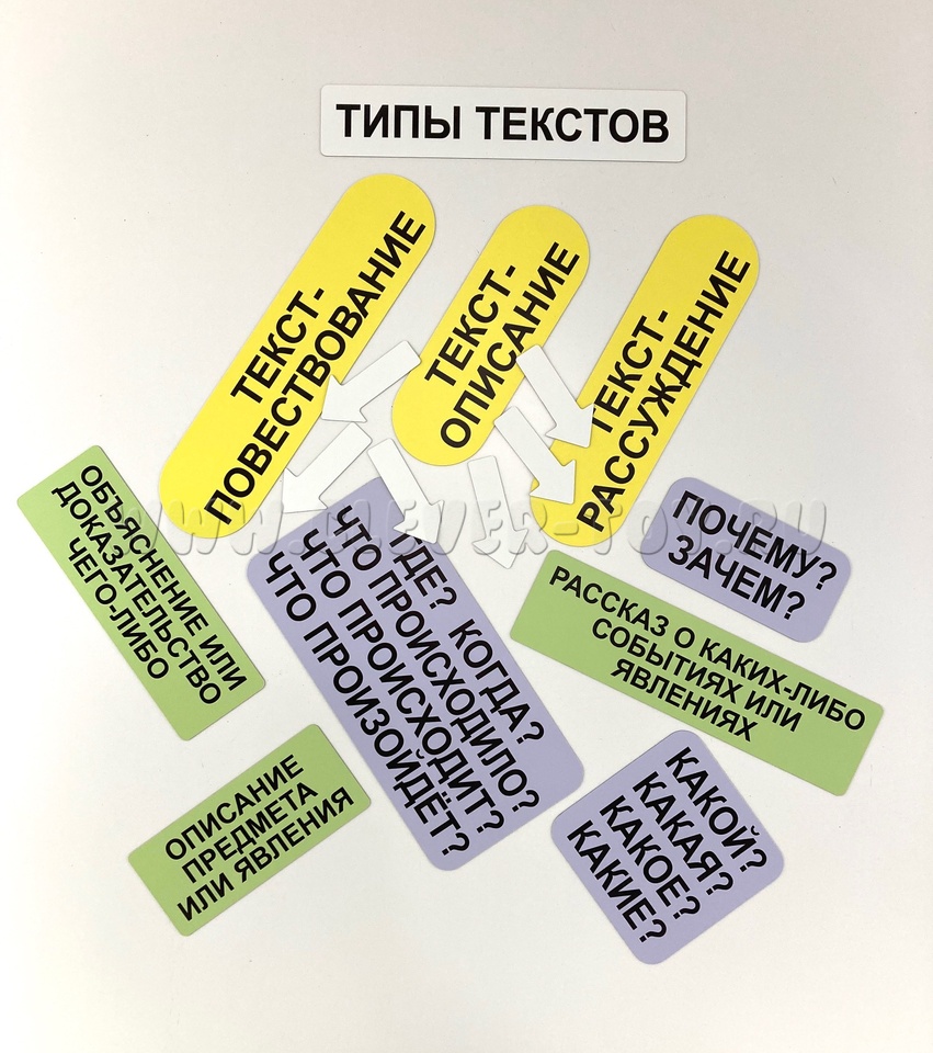 Набор магнитных карточек "Типы текстов" - это инновационный учебный материал для младших школьников (3-4 класс), разработанный с учетом возрастных особенностей детей.