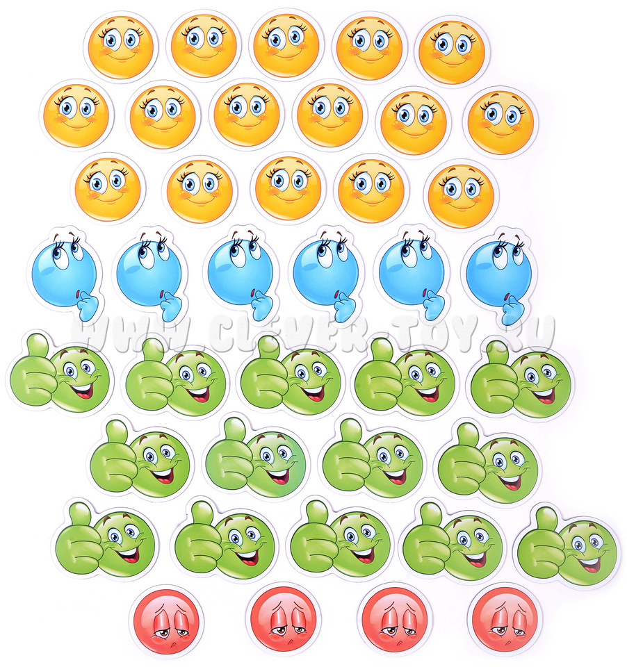 Эти смайлики-оценки отлично подойдут для школьной доски. Например, если ребёнок решает математическую задачу в четыре действия, и первые два выполнены идеально, можно поставить зелёный смайлик. Если в третьем действии допущена ошибка, то это будет синий смайлик. Если же и четвёртое действие выполнено неправильно, то результат оценивается красной карточкой.