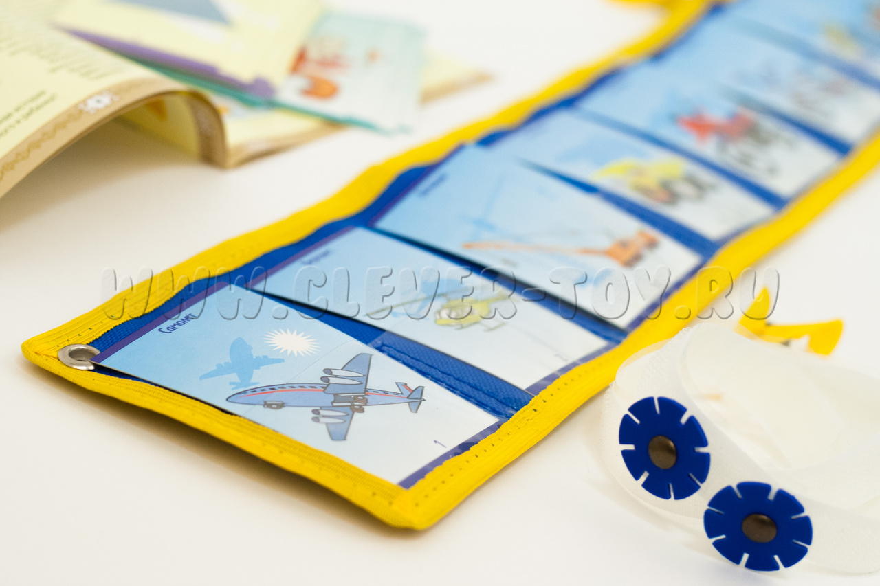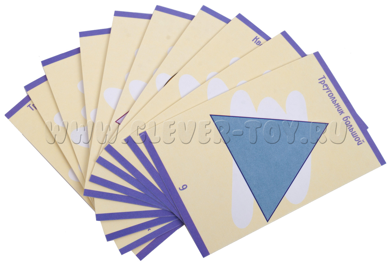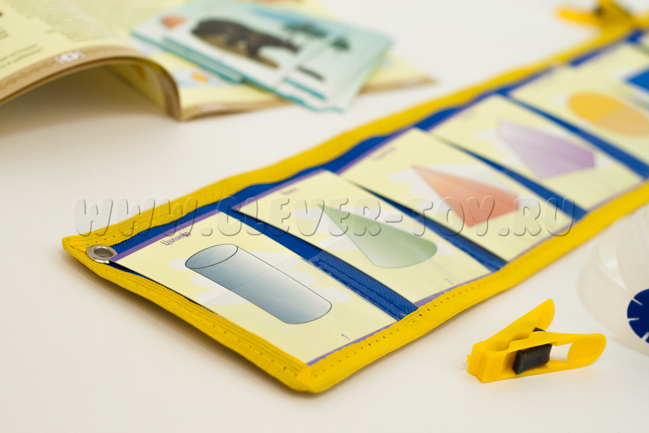 - 5 комплектов тематических картинок – «Геометрические фигуры», «Часы», «Грибы», «Транспорт», «Животные» - всего 50 карточек;