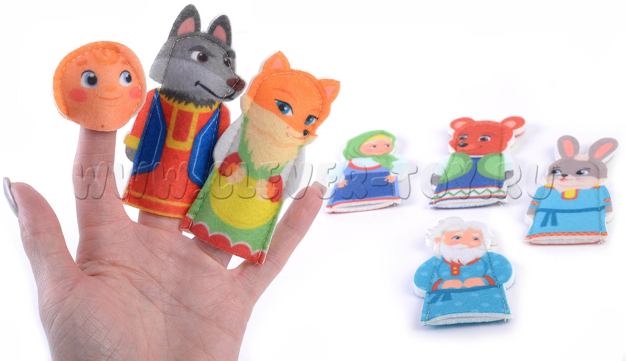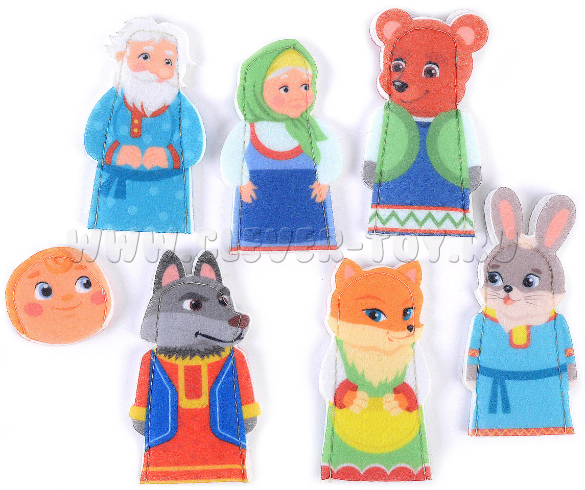 Набор пальчикового театра состоит из: 7 фигурок (размер: 9 см) с изображением сказочных персонажей сказки Колобок (Старик со старухой, Колобок, Заяц, Волк, Лиса ) и инструкция с описанием игр.
