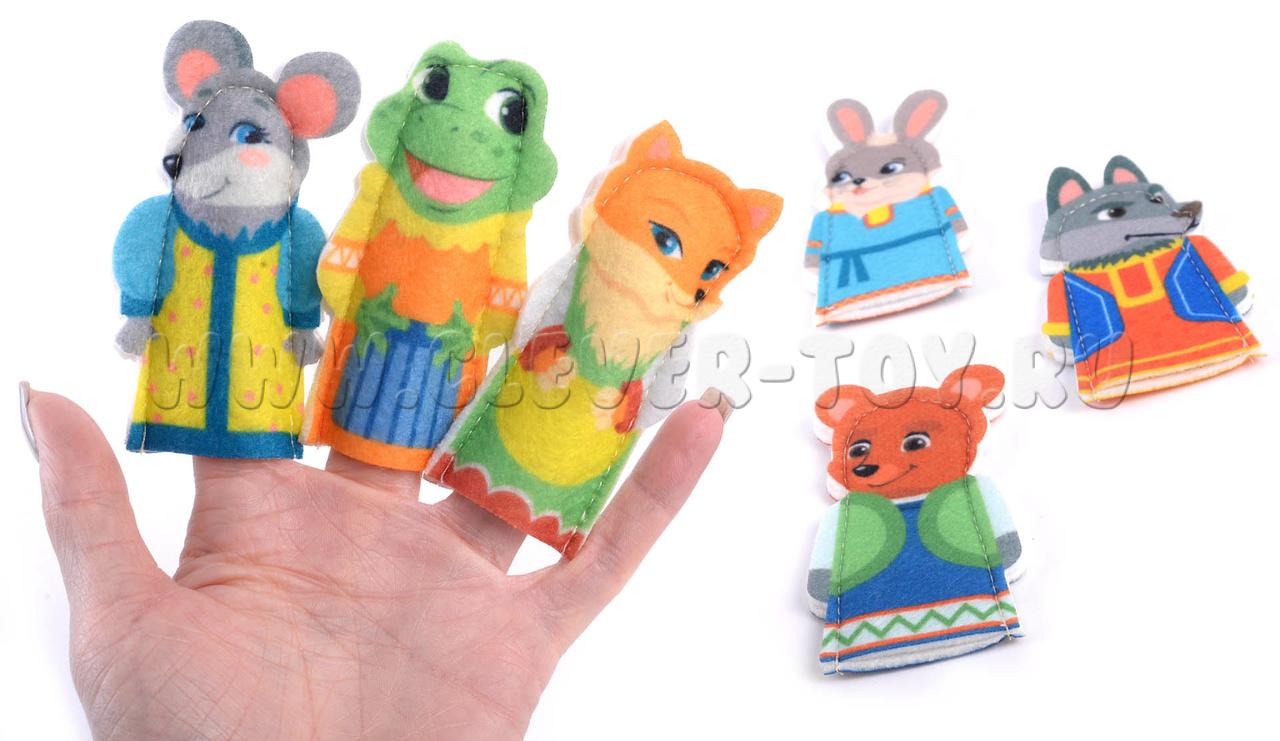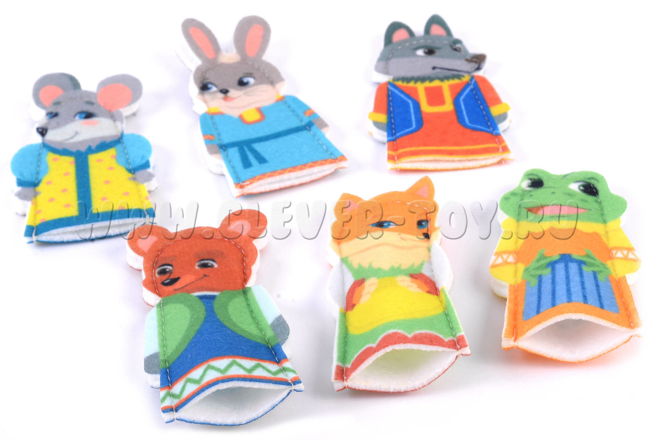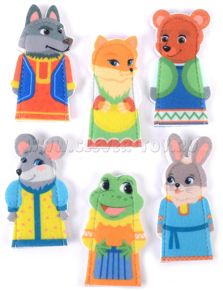 В комплект пособия входят пальчиковые куклы: мышка, лягушка, заяц, лиса, волк и медведь (6 шт.).