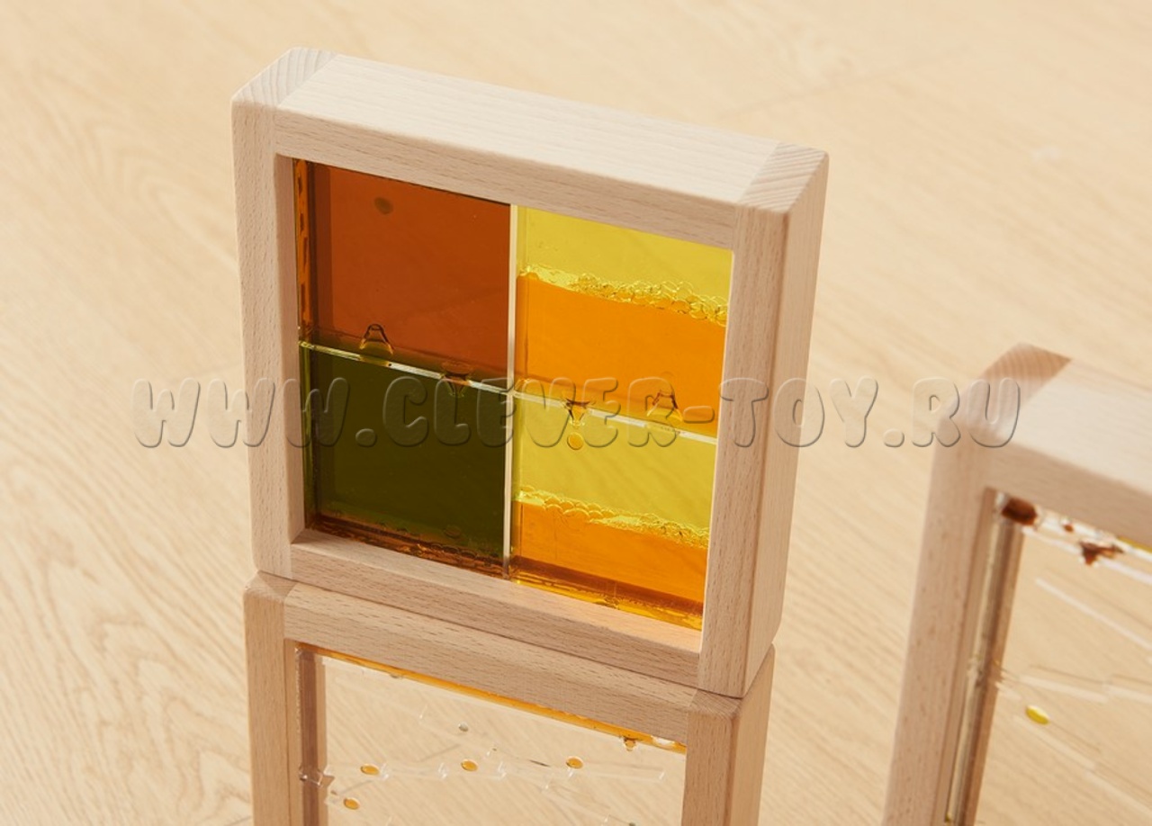 Игровой набор представлен в виде 10 деревянных блоков (6 квадратной формы и 4 прямоугольной формы) с акриловыми стеклами (прозрачными и цветными), заполненными разноцветной жидкостью внутри.