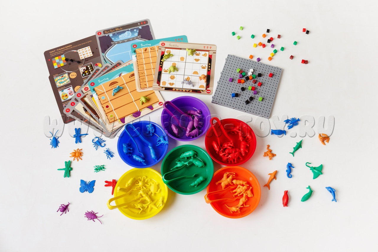 200 разноцветных соединяющихся кубиков 1 см (прилагается 25 двусторонних карточек с заданиями)