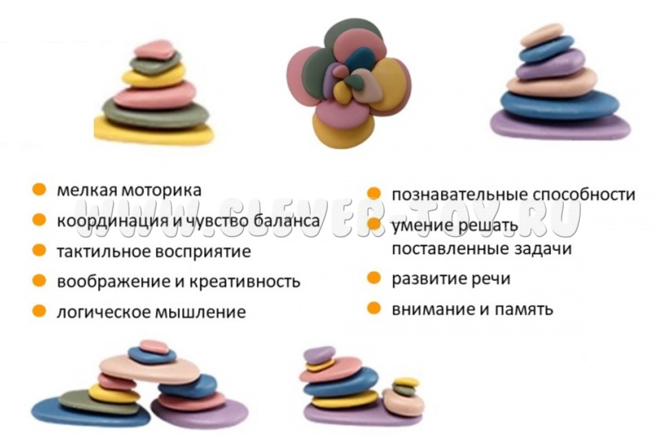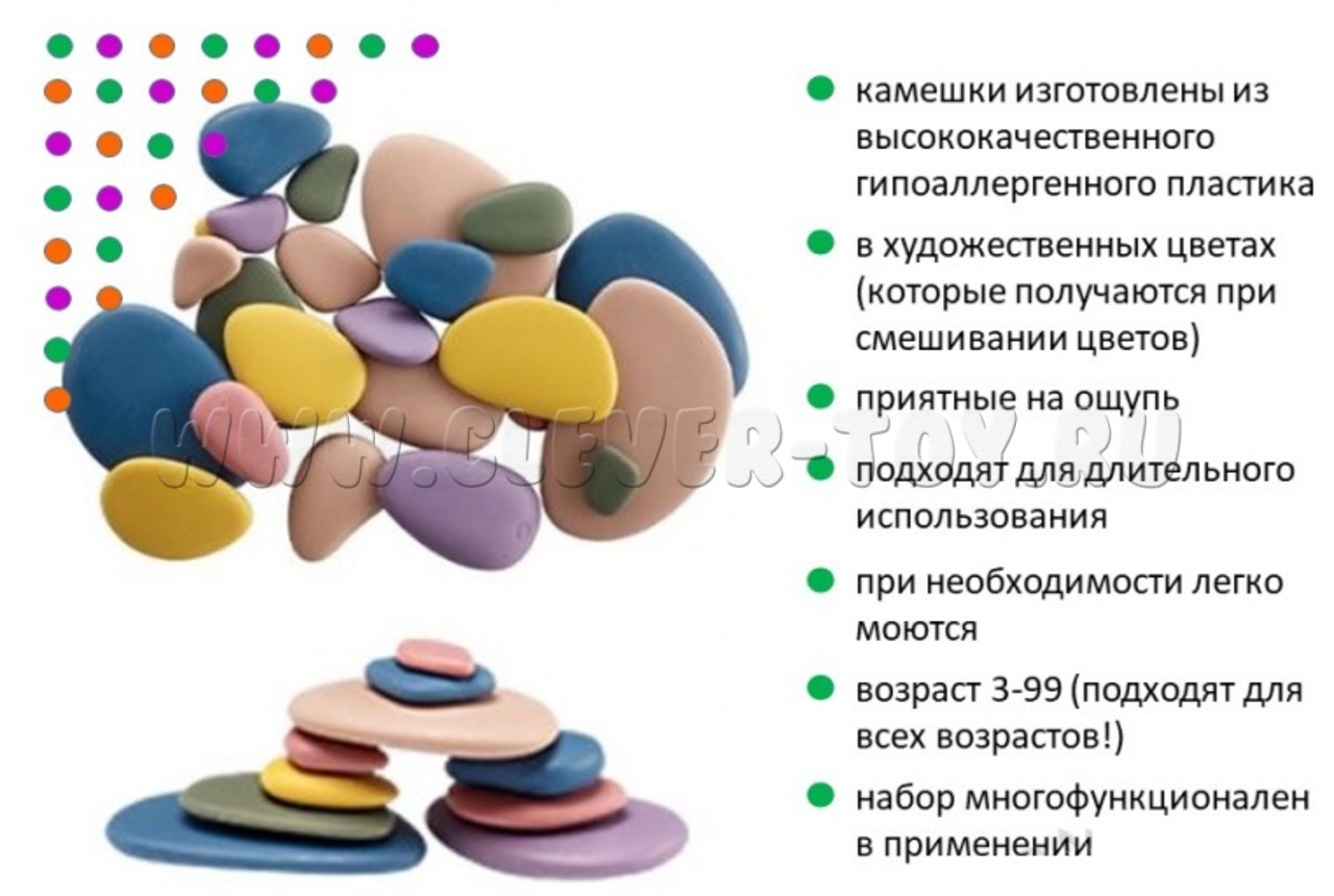 Набор "Радужные камешки" способствует сенсорному, социально-коммуникативному, познавательному, речевому и физическому развитию, а также оказывают положительное влияние на психику ребенка.