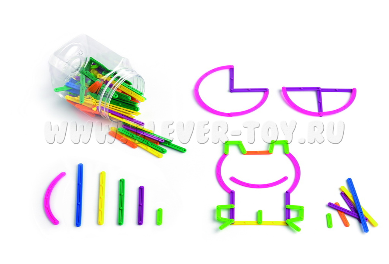 В наборе 160 элементов (6 видов гибких палочек от 2,5 см до 15 см, шириной - 8мм и толщиной - 2мм, четверти окружности) соединяющихся между собой под разными углами.