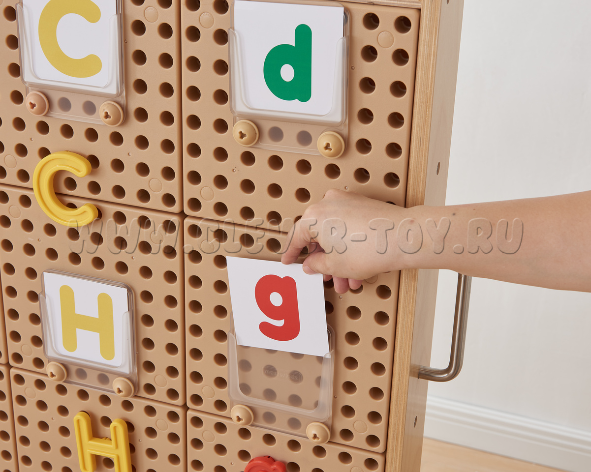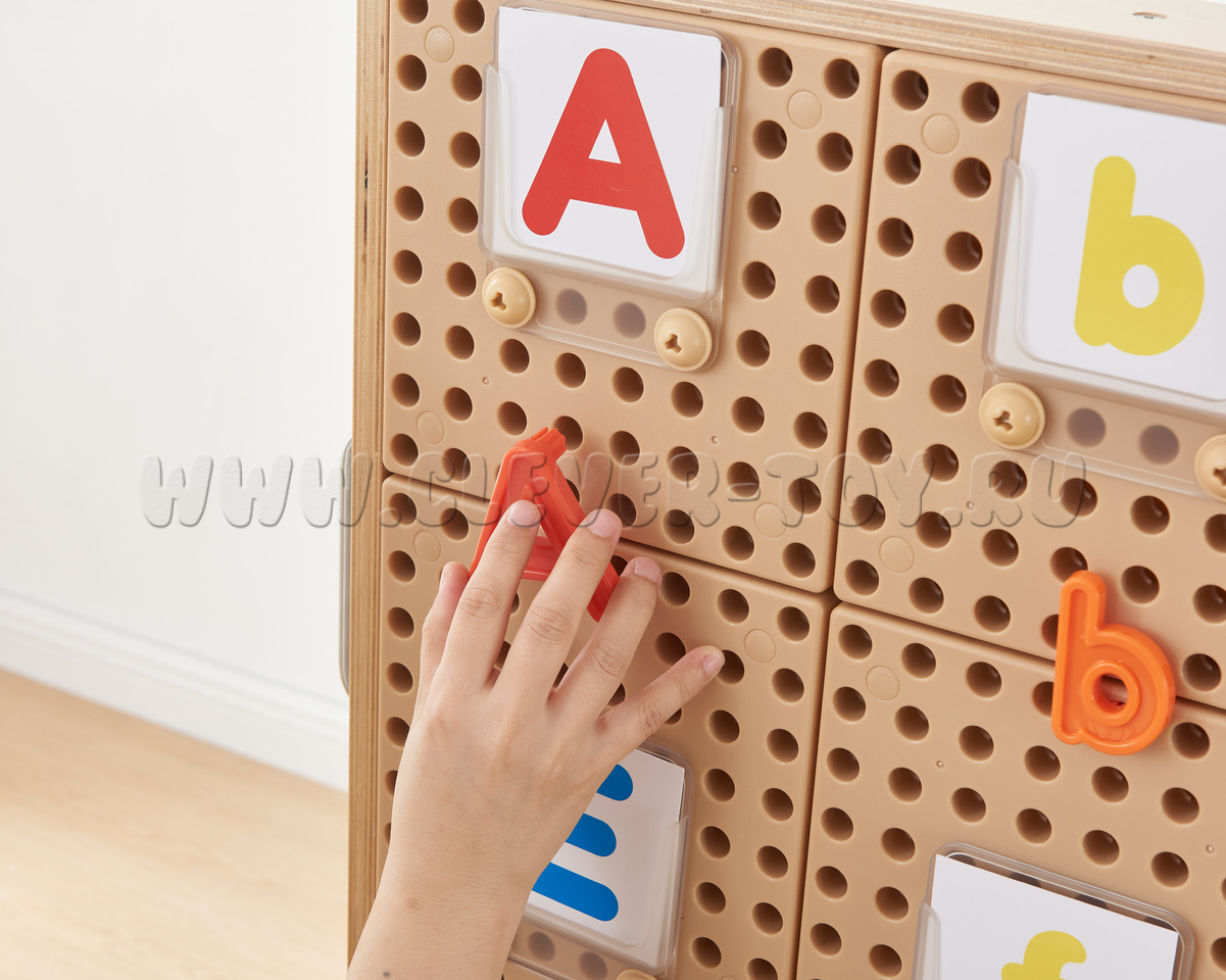 Игровой набор для знакомства с английским алфавитом, является дополнением к STEM-стене. Подходит для индивидуальных и групповых занятий. Буквы выполнены в ярких цветах (синий, красный, оранжевый, желтый, зеленый), что позволяет легко разделять их и сортировать. Дети могут составлять слога и слова из букв, а также практиковаться в их произношении.