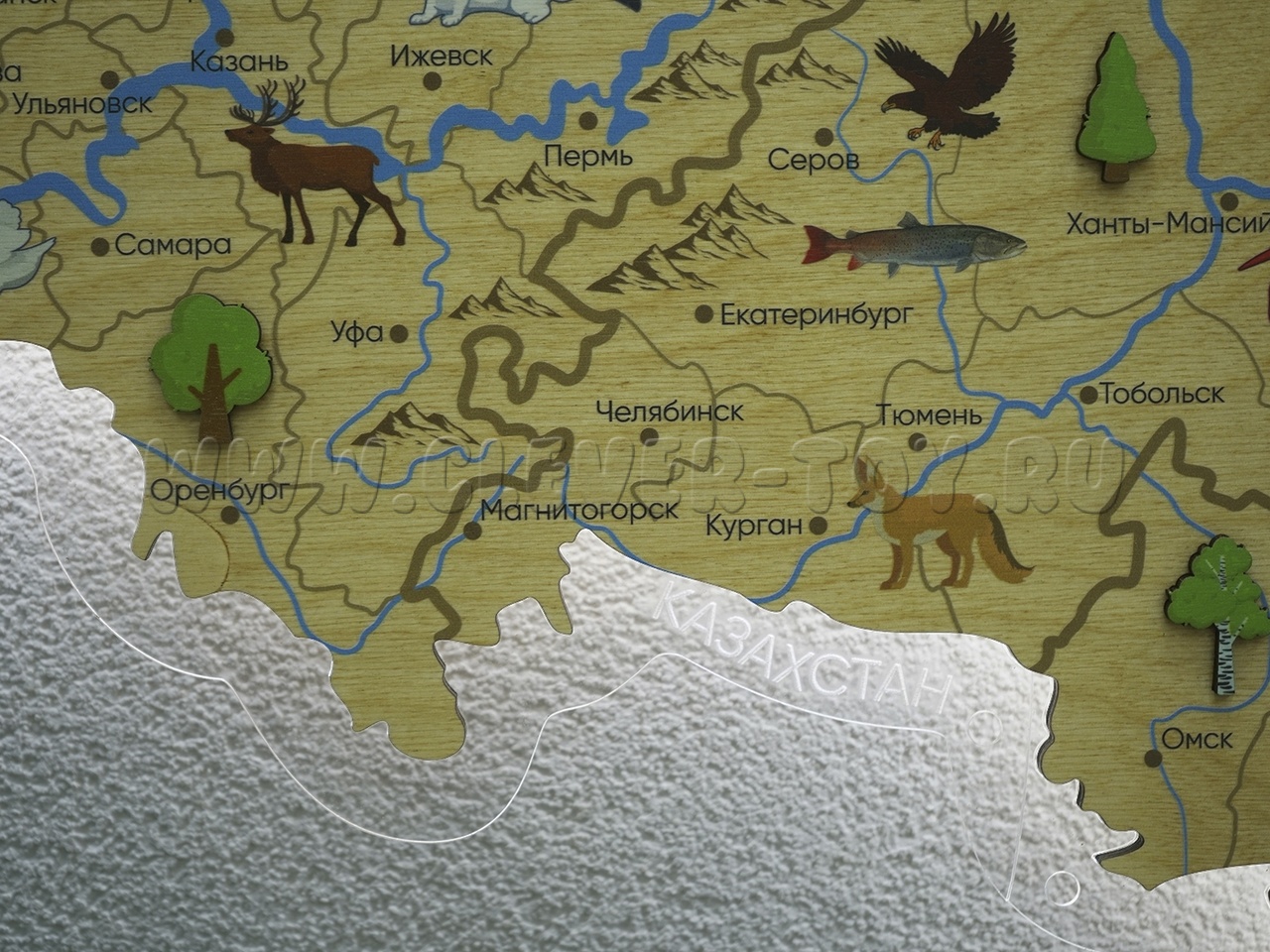 Особую эстетику карте придает подсветка и акриловые вставки, которые обозначают границу страны с другими государствами. Это позволяет карте быть не только образовательным, но и декоративным элементом.
