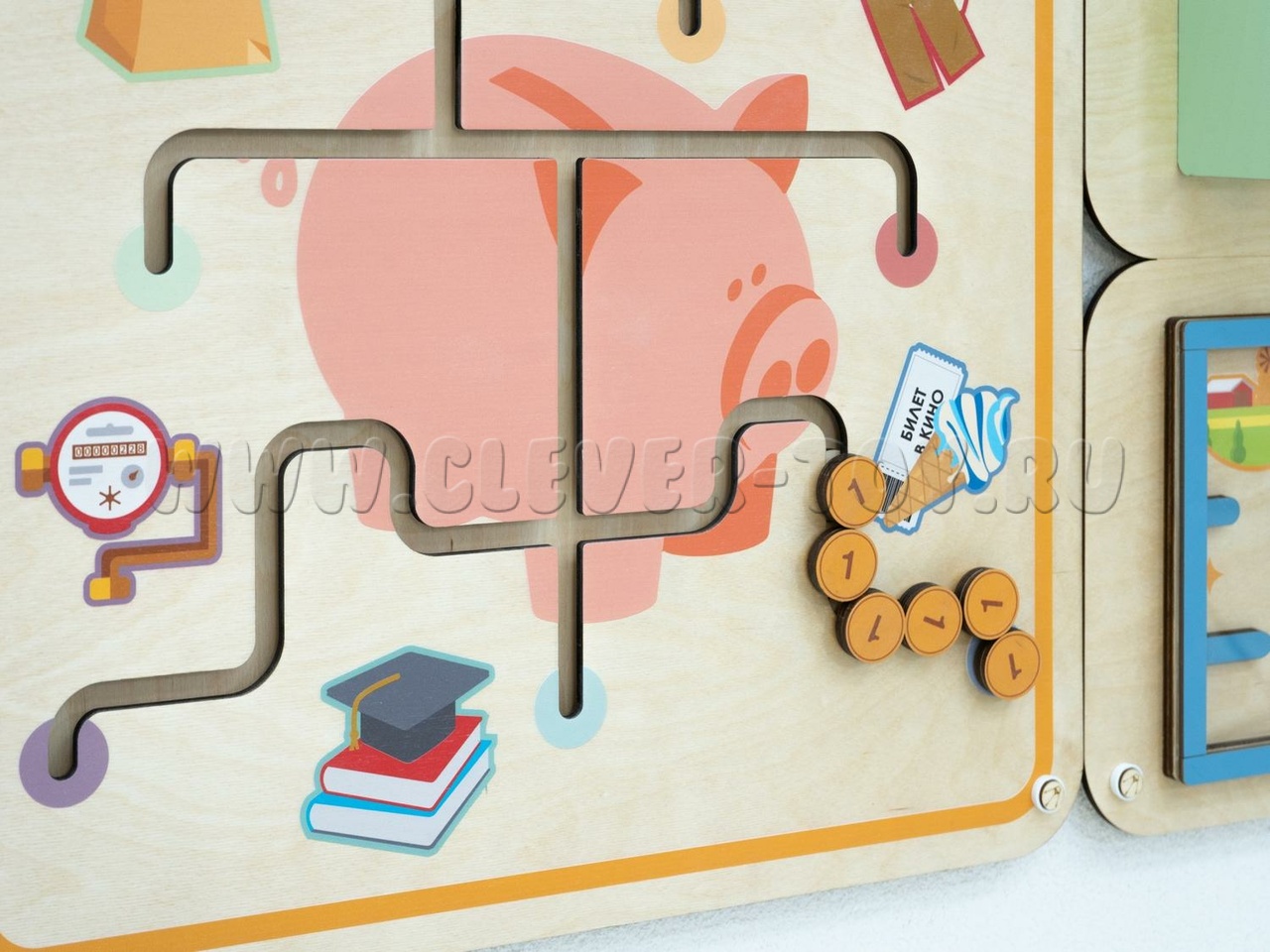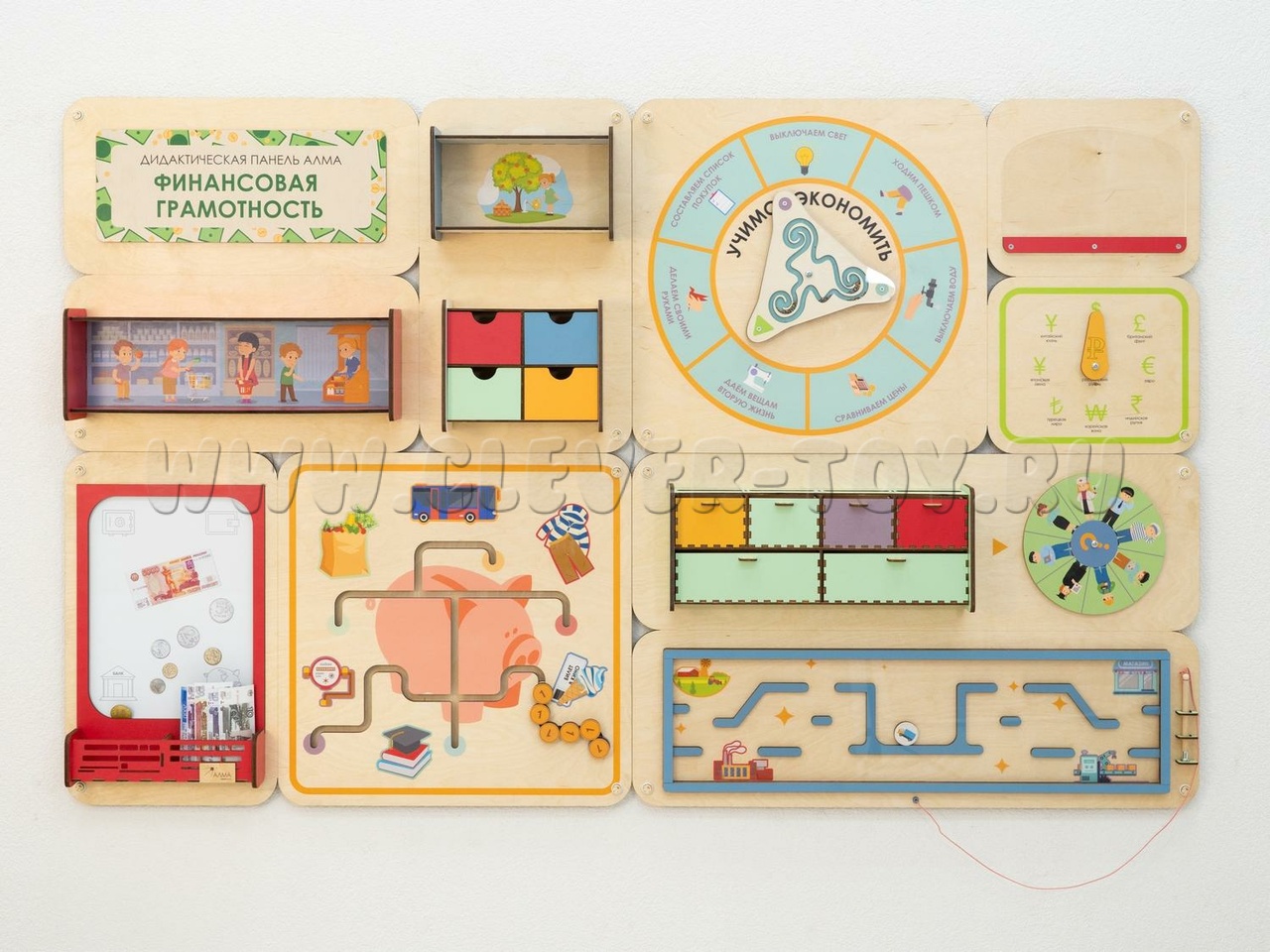Образовательно-развивающая настенная панель для обучения дошкольников в детских учебных учреждениях основам финансовой грамотности. Игровые элементы по системе Монтессори развивают мелкую моторику детей, а подробное методическое руководство помогает педагогам в проведении занятий. Подходит для оснащения детских садов и учреждений дополнительного детского образования.